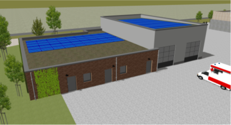 Neben modernen Fahrzeughallen umfasst das Gebäude funktionale Lagerräume, eine Hygieneschleuse sowie Umkleide- und Ruheräume für die Einsatzkräfte. Ein großzügig gestalteter Aufenthaltsbereich mit Einbauküche und Arbeitsplatz sorgt für bestmögliche Arbeitsbedingungen. Die ebenerdige Anordnung der Aufenthalts- und Funktionsräume gewährleistet einen schnellen Zugang zur angrenzenden Fahrzeughalle und erleichtert so einen reibungslosen Ablauf im Einsatzalltag.